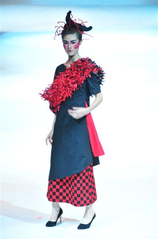 Michael Esson生于苏格兰,后移居澳大利亚,这场秀他想以一个纯正苏格兰人的身份来表达自己对中国文明与古老文化的热爱。他的服装作品简洁直白,色调以黑白红为主,人们可以隐约从中看到针灸、米字格、毛笔、折帘等带有浓郁中国情节的意象。在他的设计之下,红星贴上礼帽而嬉皮,红结爬上衣缝而性感。整套设计简单却极为耐看,中式款式的衣裙下是附有蝴蝶结的红色丝袜,使原本干练的时装显现出一种怪诞的甜美,这恐怕是任何旧中式款式所无法传达出的体验。红色一直隐含中国精神,但同时也代表了血液,是生命的象征,相信这除了黑白之外的唯一颜色是具有其双关性的。衣服上的图案也是不可忽略的细节,根部化作老鼠的百合花,倒长出尾尾羽毛的莲蓬还有变形的维特鲁威人都暗暗喻示生命的牵连和身体内部外部再虚化后的概念形态。细细品来非常巧妙,拥有看似禁锢实则激烈的生命力。整组作品旨在探讨人类身体与肢体,内部与外在,同时也参照了人体比例,人体解剖图解,针灸示例,和手术过程等相关内容。