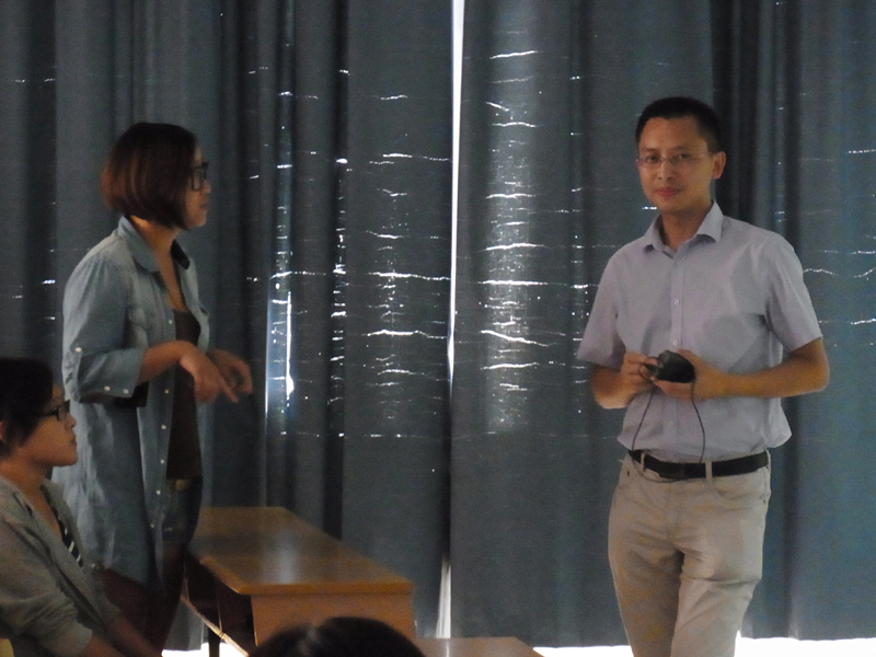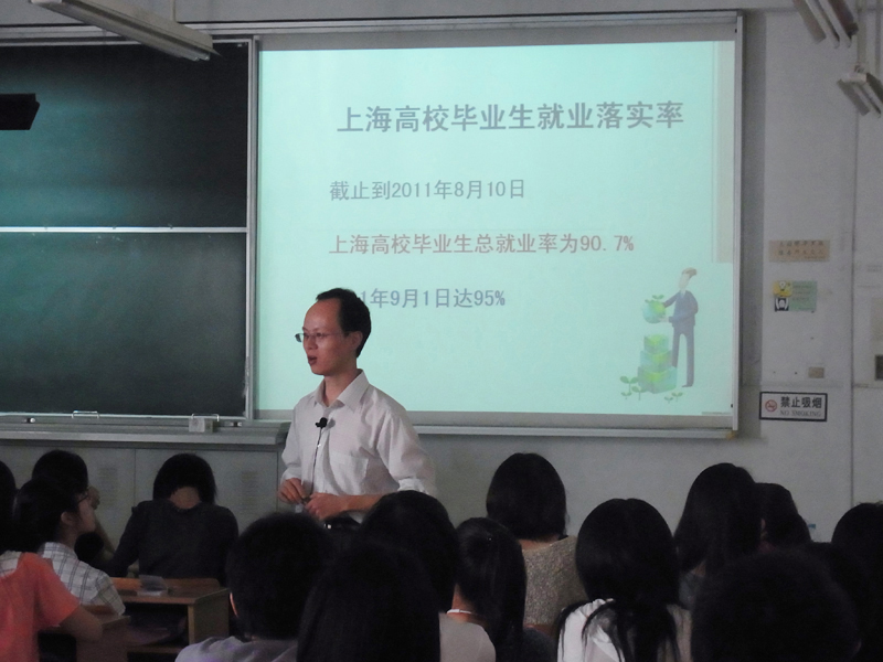 2011年9月27日,服装学院邀请了劲霸男装人力资源总监邵丹先生与就业指导中心的胡海洋老师,就大学生职业规划问题做了“大学生职业选择与准备”与“2012年高校毕业生就业形势与政策解析”专题讲座。下午1:30,讲座在孙晨阳老师的主持下在四号教学楼410室准时进行。