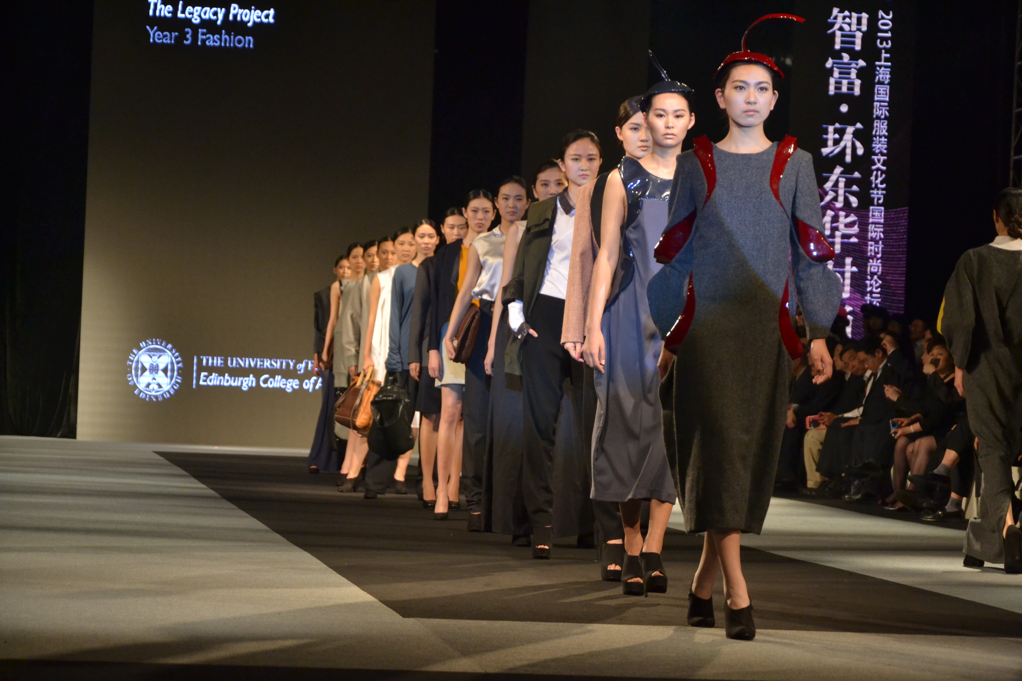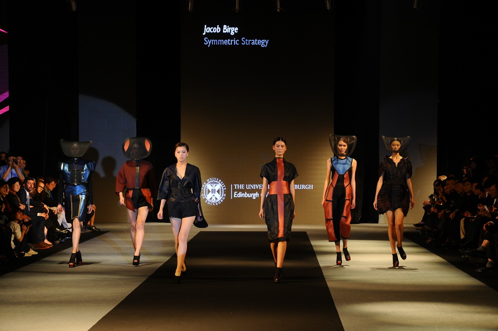 开幕式首秀是最首追捧的一项表演,共有14组来自爱丁堡大学艺术学院学生的优秀作品展出。整场秀集音乐灯光舞台于一体,让在场的每一位观众都享受到了一场全方位的饕餮盛宴。该场秀以时尚女装设计展示为主,男装设计为点缀。男装的样式虽然不多,但是以服装的面料质地,制作的精致度来说,还是很具有细节之美的。