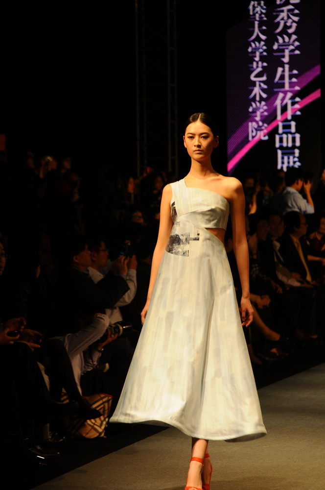 女装秀之中,第十组的流速系列较为精彩,白色的流沙,既飘逸又显得清新洒脱,模特高挑的身材更显衣料的通透。其他几组的服装也各具特色,十一组的阿拉伯风情系列,显得与众不同;第十二组粉黄的色调给人直击心脏的强烈冲击;同样第十三组的桔黄色调也有很强的视觉冲击力,但不同的是这组的服装应用了些许漆皮的元素,有些清纯的摩登的感觉。除应有的服饰之外,不管是发型还是首饰配件,爱丁堡大学的年轻设计师们都做了得当的设计。