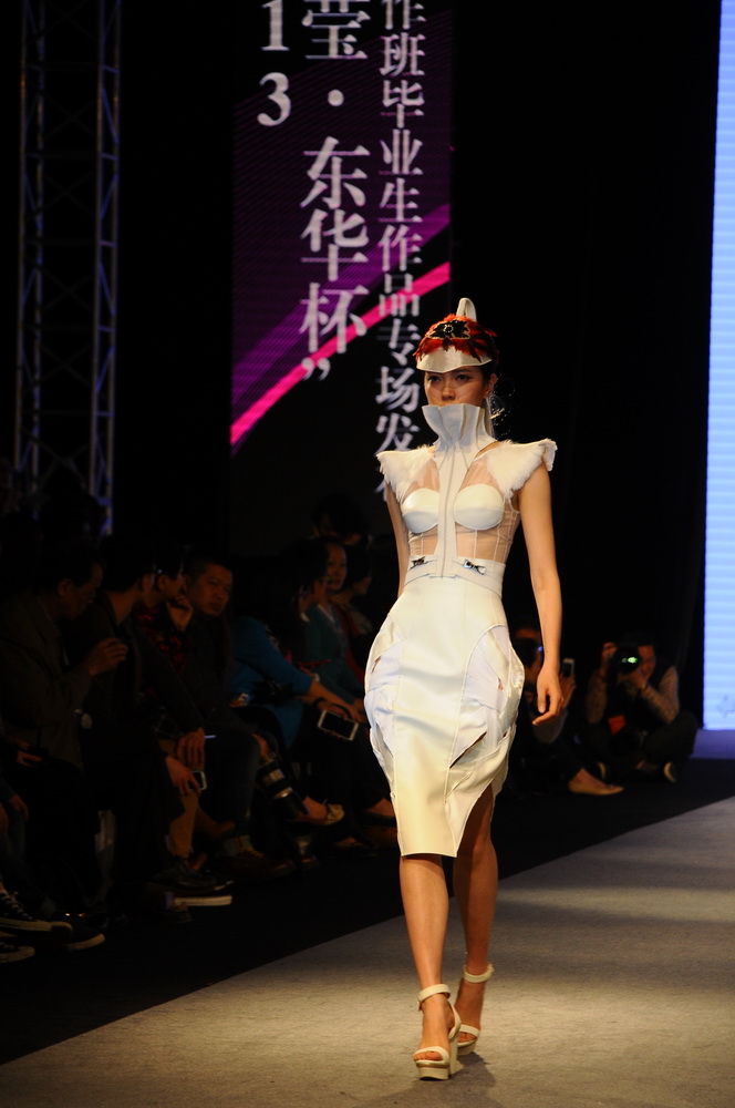 终于,在万千观众的翘首期盼中,“雅莹•东华杯”中日合作班毕业设计作品专场发布会于上海世贸商城四楼盛大召开。离走秀还有将近一个小时的时候,上海世贸大厦展厅挤满了对此次“雅莹•东华杯”中日合作班毕业生作品满怀期待的人们,有心怀忐忑等待获奖结果的参赛设计师们和他们的辅导老师,看台上交际等待着开场的观众,来自全国各地知名服装品牌公司的嘉宾。现场的摄影师不断变换位置以求得到最佳的角度,调音师和主持人一遍一遍的磨合着。随着动感的旋律响起,屏幕上放映的服装摄影点燃着全场的气氛,终于四周灯光暗下,旋律一转,只见模特身着设计精心策划一个月的服装总T台的尽头缓缓地走出来。