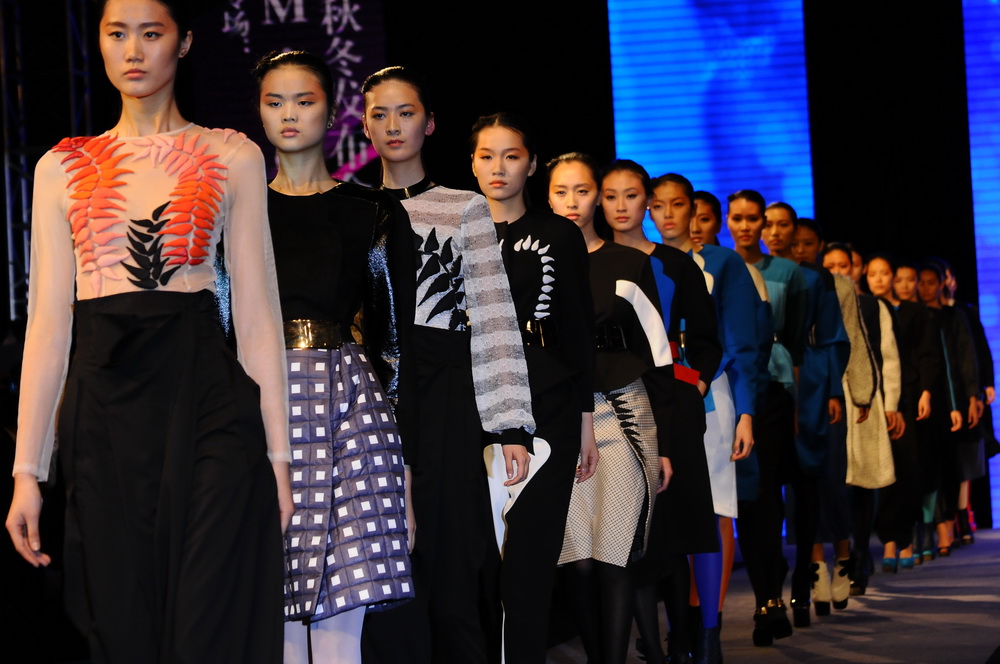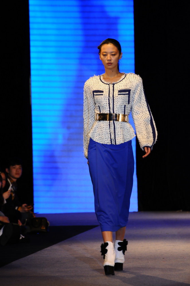 整场发布会总共50套衣服,刘灿明老师坚持以往的成衣风格。其中,主要可以分为两个类别:一部分是以雪纺和轻薄的针织材料为主的套装,虽透,却又不失一种中国女性的含蓄与性感。上身紧,下身松,是它的特点。在下身采用裙裤装,肥大的裤脚再加上前片的覆盖,让人感觉似乎又回到了八九十年代,巧妙而又时尚。另一部分则以大衣为主,潜水服面料和羊绒材质的采用,色彩面料的拼接,简单明了,宽松的版型选用配以精致的腰带,让中性风格不再普通。在最后的压轴之作上,刘灿明老师选用了一套以红色和黑色棉质小叶片装饰的透质上衣,加上一条前面褶裥的纯黑色裙裤,脚上则穿桃红色泽的带铆钉高跟鞋,高挑气质型的模特演绎,让整场发布会再次回到高潮。