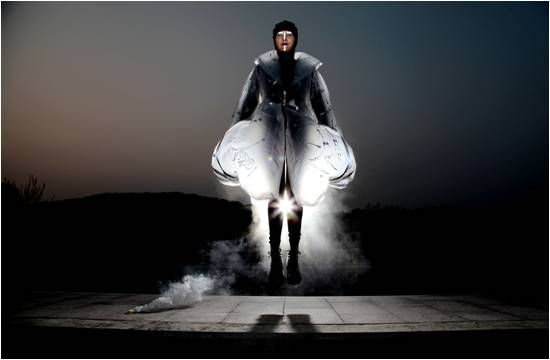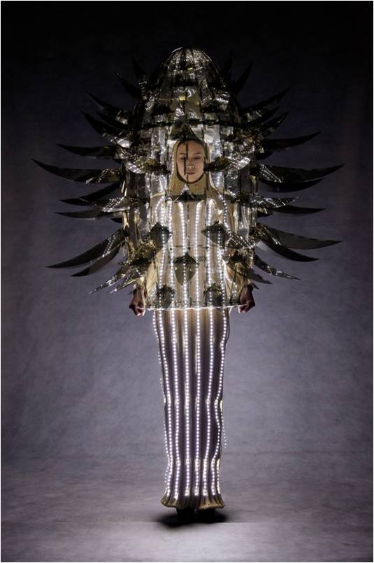 周老师指导的徐立豪同学作品“Lonely Queen”获得了美国开放组提名奖。这是一件富有现代感的佳作,给人了无限的遐想。金色PVC复合单透膜制成的椭圆外壳布满尖锐刺。这种源于俄罗斯套娃的设想让人更容易想起俄罗斯伟大的短篇小说家契诃夫的名作《装在套子里的人》,孤独、陌生、恐惧等复杂的情感扑面而来,然而在这负面情绪的集中表达中,流线型设计的LED灯在秀场灯光的变化配合下,迫使这样的情绪变得扑朔迷离,忽隐忽现。
