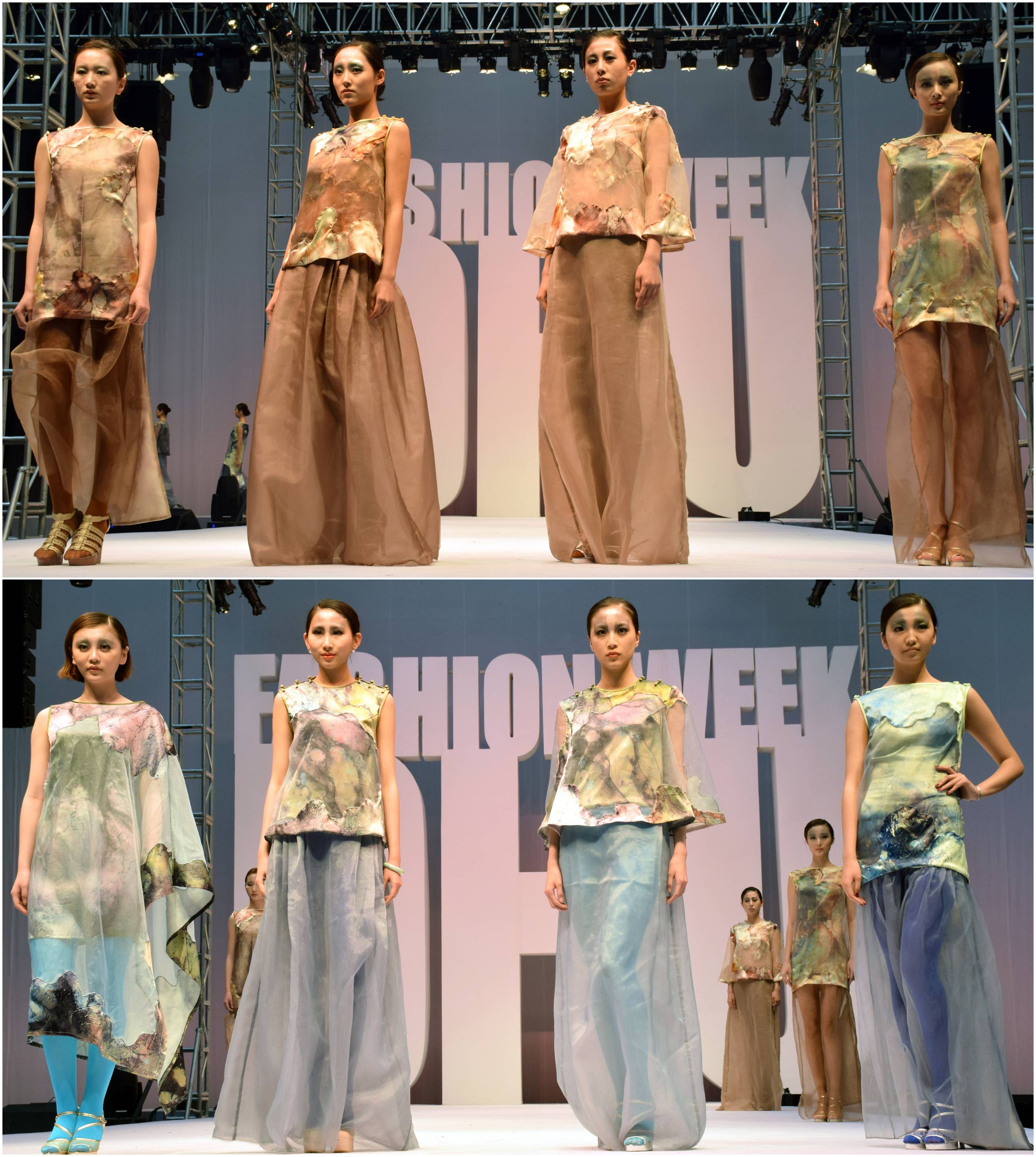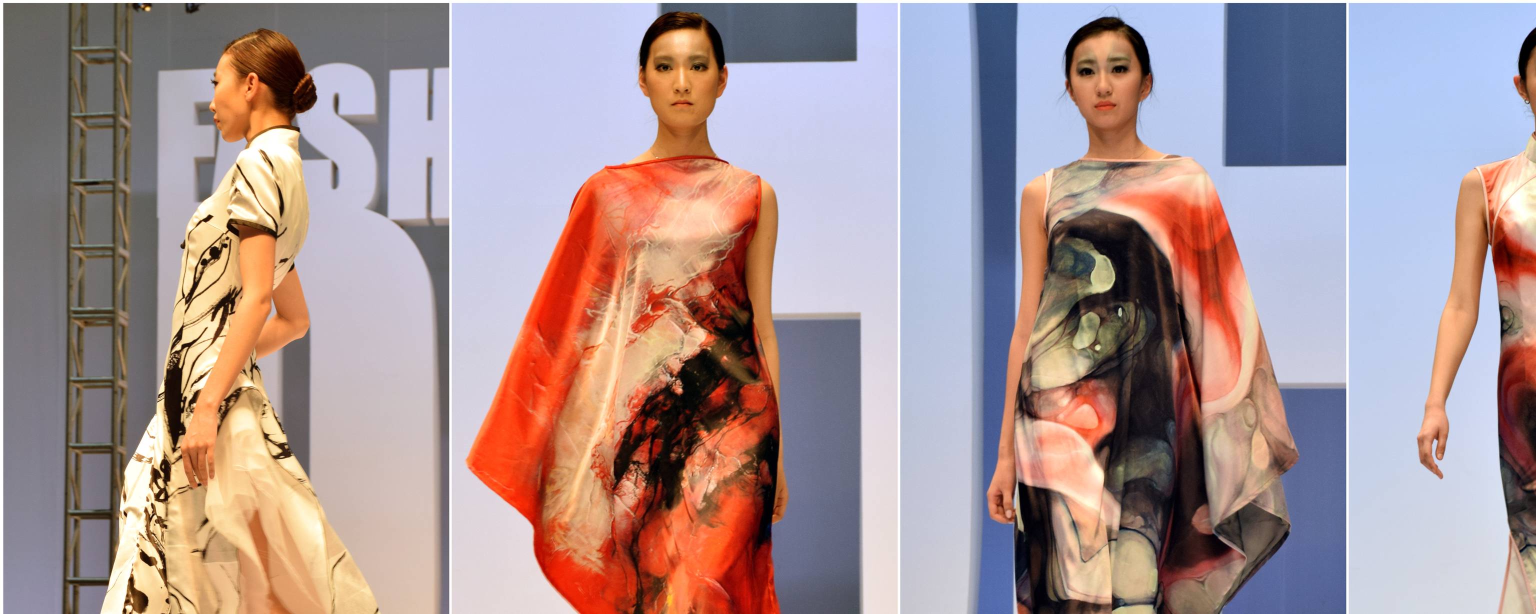 大写意系列的服装图案是胡伟达老师的即兴创作。在后台,我们有幸看到胡伟达老师的随心、淡然创作过程。更有童龄老师压轴出场走秀。