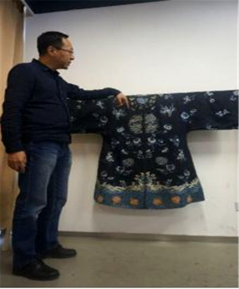 讲课结束后,卞老师给学员们分析了两件经典的清代服装,其中红色衣身的是19世纪清代诰命夫人正式场合所着,衣服宽大,胸围接近50cm,袖口更是达到40cm左右。中央绣有蝴蝶环绕的仙鹤图案,下摆绣精致的海水江崖图案;深蓝色的一件同是女装,在平时生活的正式场合穿着,为三蓝色绣花,图案变化丰富,下摆所绣的海水江崖相对较简约。
