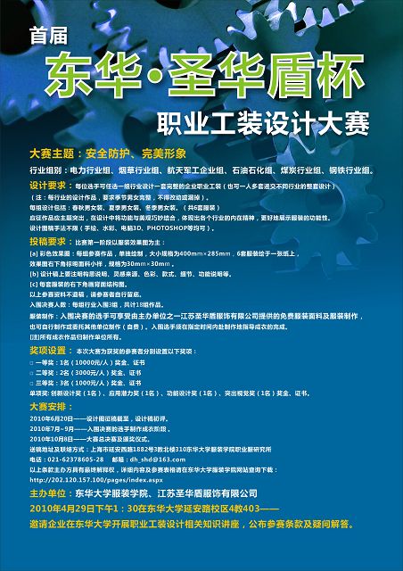 领导及资深专业教师、江苏圣华盾服饰有限公司领导及专业人员等共同组成评委;为保证作品遴选的公正性上述评委名单将于宣布评奖结果的同时公布。