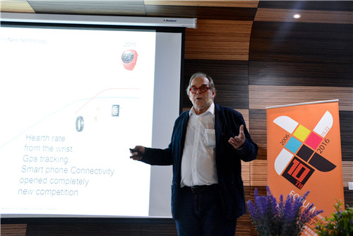 论坛开始Tapani Hyvonen教授首先向大家进行了以Design Thinking为主题的演讲,以个人履历作为出发点介绍了1990-2016年间获得的奖项,以详实的案例为基础介绍了穿戴技术的发展历程并分析了研究的主要成果与穿戴技术载体。