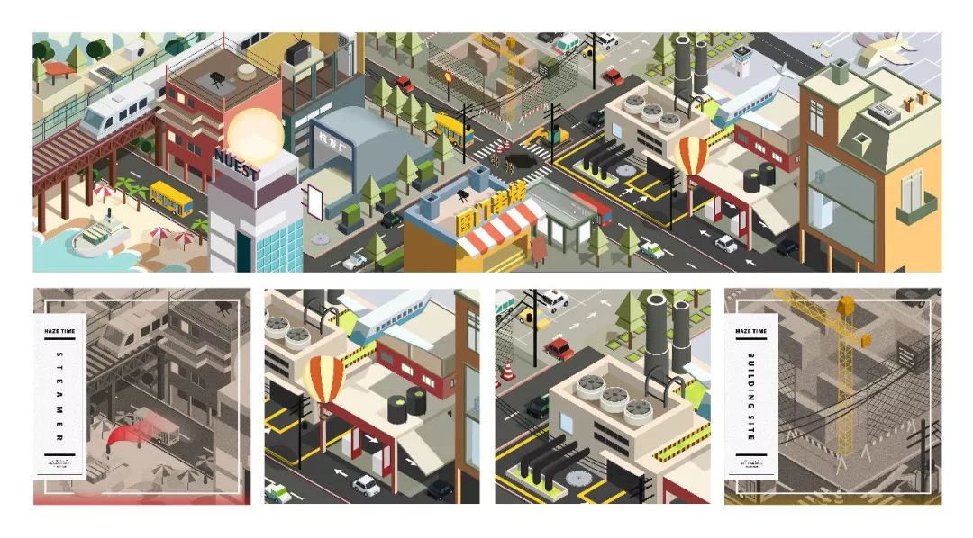 以2.5D插画为表现形式,挑选了雾霾作为插画的主题。插画由一些日常生活中的污染源构成,通过画面色调的前后对比来凸显“雾霾”主题。