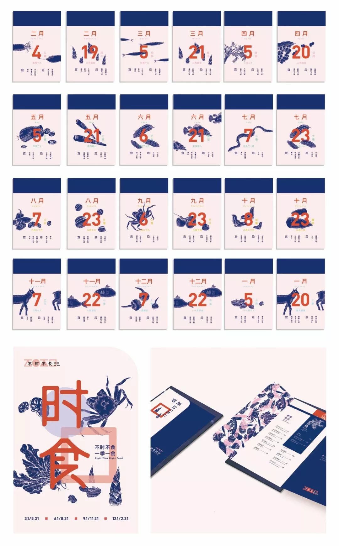 “不时不食”出自《论语》意为吃东西要应时令、按季节,到什么时候吃什么东西。现如今科技发达,反季节食物当道,人们想吃什么就有什么,时食这一理念被渐渐遗忘。“不时不食”主题餐厅的vi设计以传递这一理念为目的,将传统元素以更加现代的手法和配色展现。特别设计的四季更换的菜单,用插画表现各个季节代表食物,同时辅以展示当日饮食注意的日历,旨在将“不时不食”的理念在用餐中传递给人们。