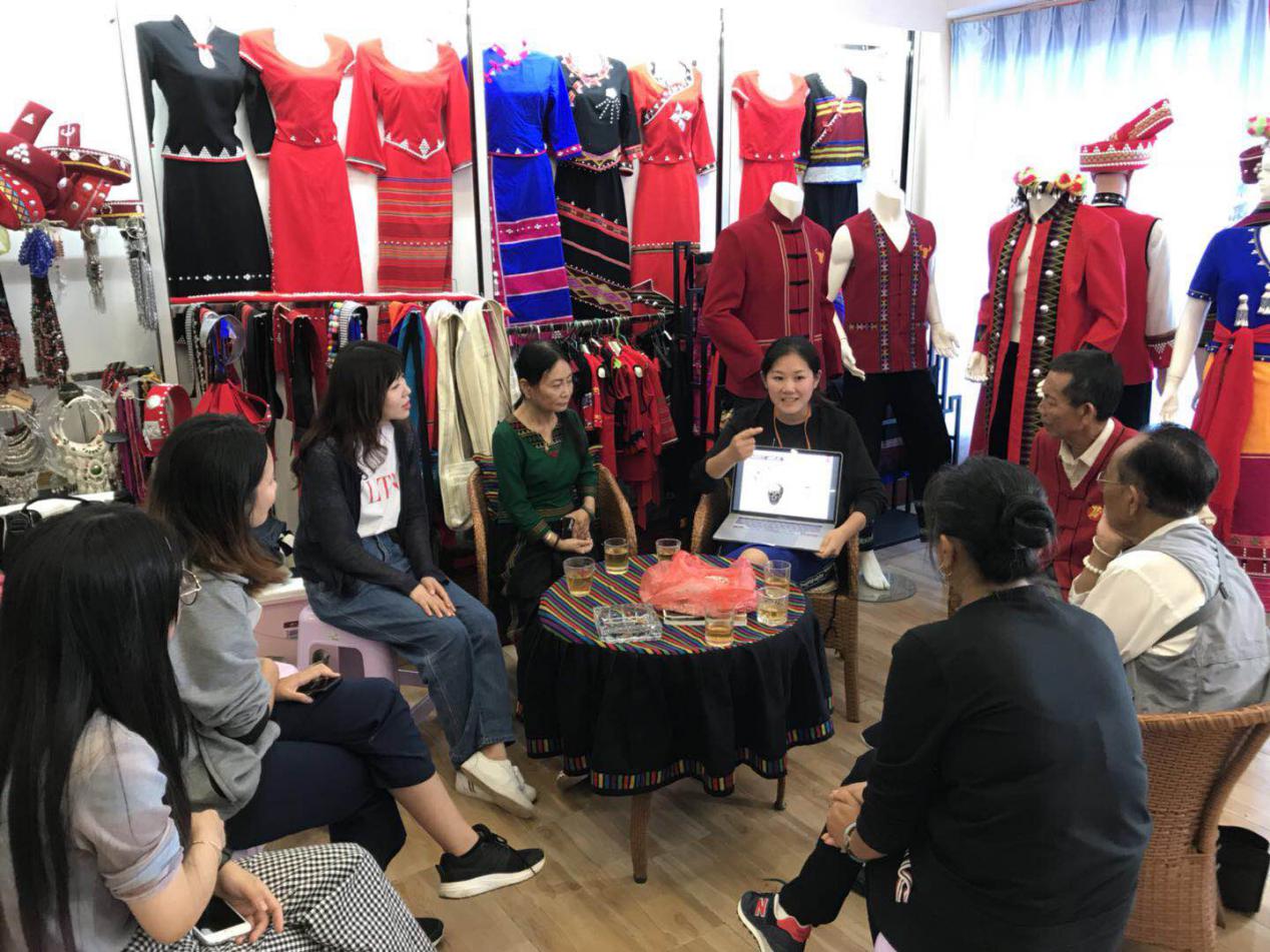 值得一提的是,团队和佤族文化研究的几位老前辈们开展民族服饰座谈,拜访了巴饶民族服饰服装店。这家店是当地一名“特殊的残疾人”陈红疆大姐开的,她虽有残疾,但仍四处收集佤族民族元素,展开服装和服饰从设计、制作到销售的全过程,服务于当地佤族人。她非常用心地经营着这家店,现在已经初见成效,店里也聘请了多名下岗工人和残疾人士一同创业。通过座谈,团队师生从沧源佤族自治县中国佤文化研究发展中心的前辈老师们那里得到了很多关于佤族服装的历史发展、特点表现和存在的问题,同时结合东华在服装服饰方面的经验提出了很多关于佤族文化传承的建议,希望她们能够带领着当地的积极分子走出来多看看、多学学。当地民众也希望东华的专业团队能够走进沧源,用专业的力量协助她们脱贫致富。