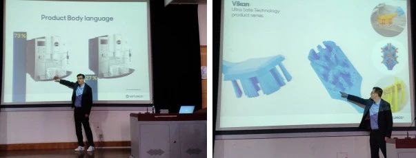 在最后的设计流行趋势分析中,Sore Fralm先生别出心裁地利用咖啡机的案列为大家做出讲解。他将两个看起来形貌特征都相差无几的咖啡机让同学们进行挑选,多数人都不约而同的选择了左边的咖啡机。Sore Xerxes先生对其做出解释:带来选择数据的差异仅仅是因为正面机身上两条不同朝向的弧线,左边的咖啡机身上的弧线朝上,不禁让人联想到微笑的唇角,而右边朝下的弧线,自然给人以相反的心理体验。就是这么一个简单生动的案列,让大家瞬间领会到了设计流行趋势在产品项目中的重要性。