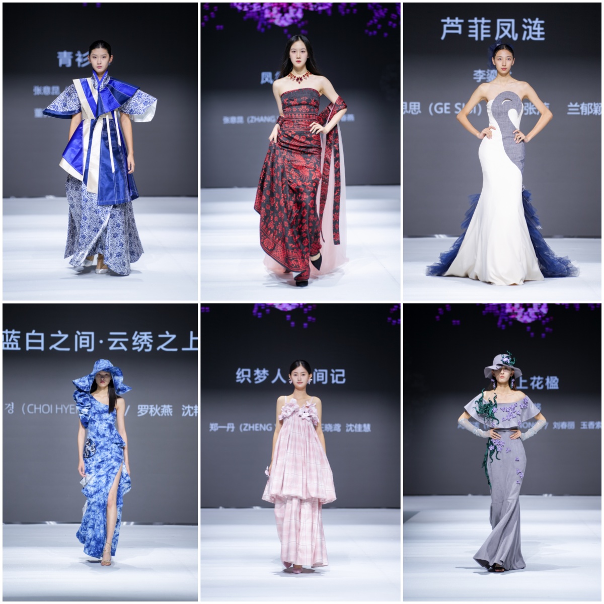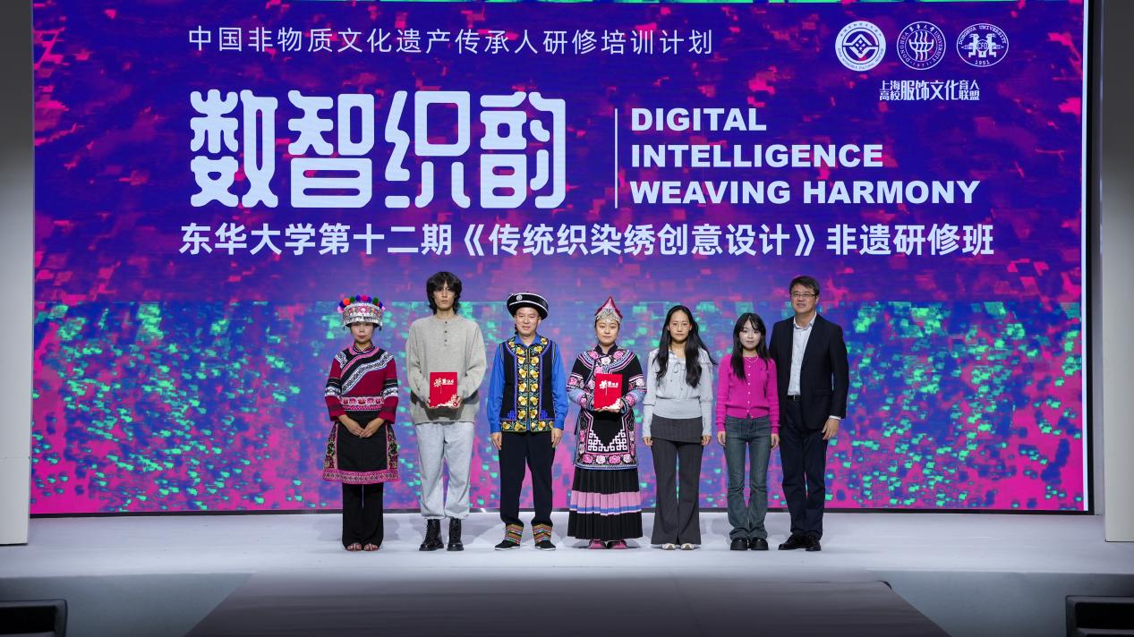 《数智织韵·非遗新生》非遗服饰文创与数字艺术联展同期在校举办,展出400余件具有代表性的传统织染绣面料和纹样样本,以及学员设计创作的服装服饰、文创产品等,把傣族织锦、阜阳刺绣、畲族服饰、上海药斑布印染、崇明土布编织等非遗技艺巧妙融入家居装饰、服饰箱包、国潮周边、IP形象等设计中,还有学员与企业进行合作或计划量产研培作品,实现文化传承的商业落地。
